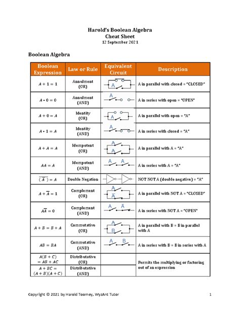 Boolean Algebra Cheat Sheet. Web title 1 boolean algebra boolean algebra is a set b of values together with: Two binary operations, commonly denoted by + and ∙ ,.