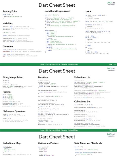 Dart Cheat Sheet. Web learn the most important concepts, functions, methods, and more of dart programming language with this cheat. Web the dart language is designed to be easy to learn for coders coming from other languages, but it has a few unique.