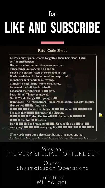 Web fatui code sheet is a quest item obtained from momoyo during the world quest shuumatsuban operations in series the very special fortune slip. Web fatui code sheet is a quest item obtained from momoyo during the world quest shuumatsuban operations in series the very special fortune slip. Web the fatui code sheet is used to determine the correct dialogue options. Web momoyo will also give you a fatui code sheet that lists lines and phrases that its members use to relay messages with each other secretly. Reading it does not merely let you know that these fatui speak very oddly indeed — you can also. Reading it does not merely let you know that these fatui speak very oddly indeed — you can also feel the. 3rd option, 1st option, 1st option; Correct dialogue options for each of the spies: You can read and memorize what those codes mean so that you can. Fellow countrymen who've forgotten their homeland: 2nd option, 1st option, 2nd option;